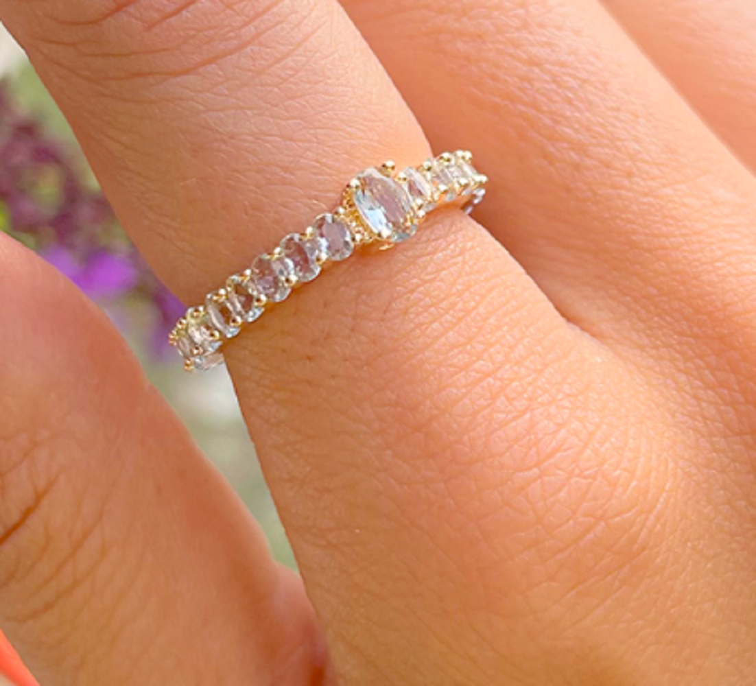 Aliança inteira cravejada em cristais sintéticos de topázio azul, sendo as laterais em formato e a central, maior, em formato oval.