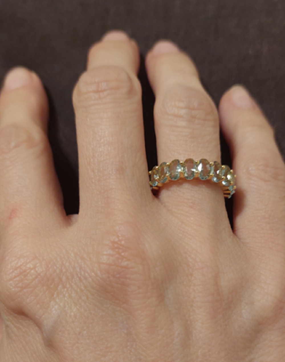 Aliança larga inteira em cristais sintéticos de topázio azul, em formato oval.