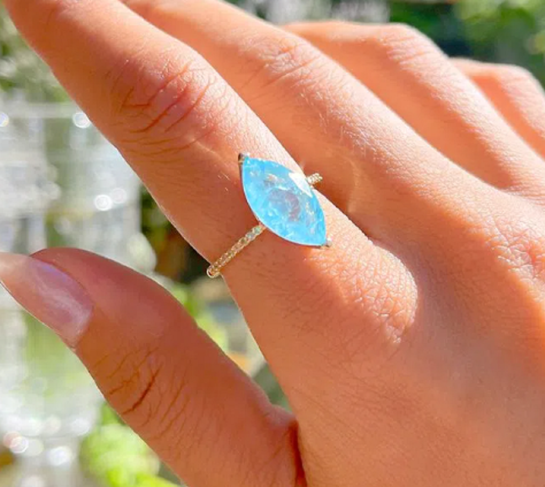 Peça banhada a ouro, com um pedra central de calcedônia fusion, com detalhes de zircônias fumê na lateral.