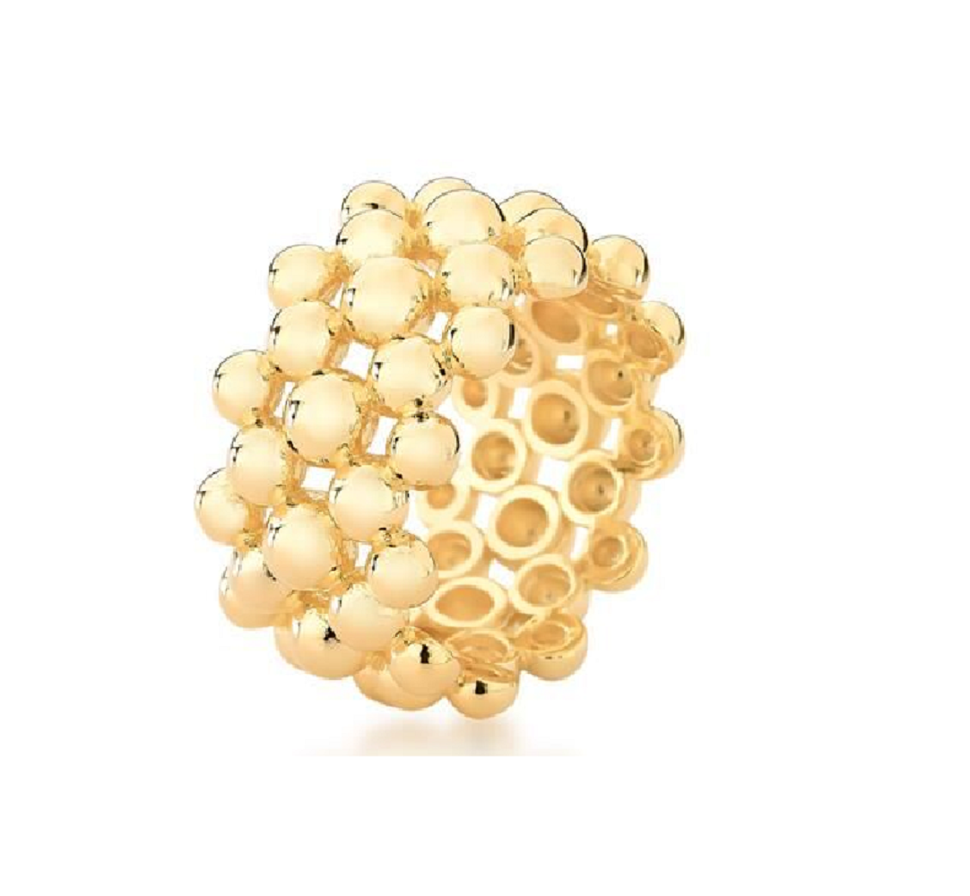 Anel em metal com banho de ouro, detalhes esféricos por toda extensação.