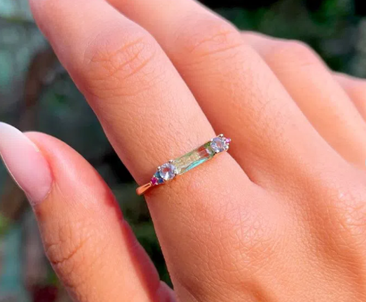 Anel estilo palito, com detalhes de cristais sintéticos de ametista verde e lilás, além de nano turquesas e zircônias vermelhas.