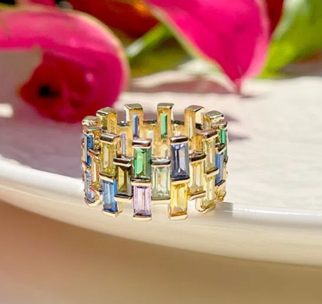 Anel com aro largo, totalmente cravejado com cristais sintéticos de tanzanita (azul), esmeralda (verde), citrino (amarelo), ametista (roxo) e topázio azul, em formas retangulares.