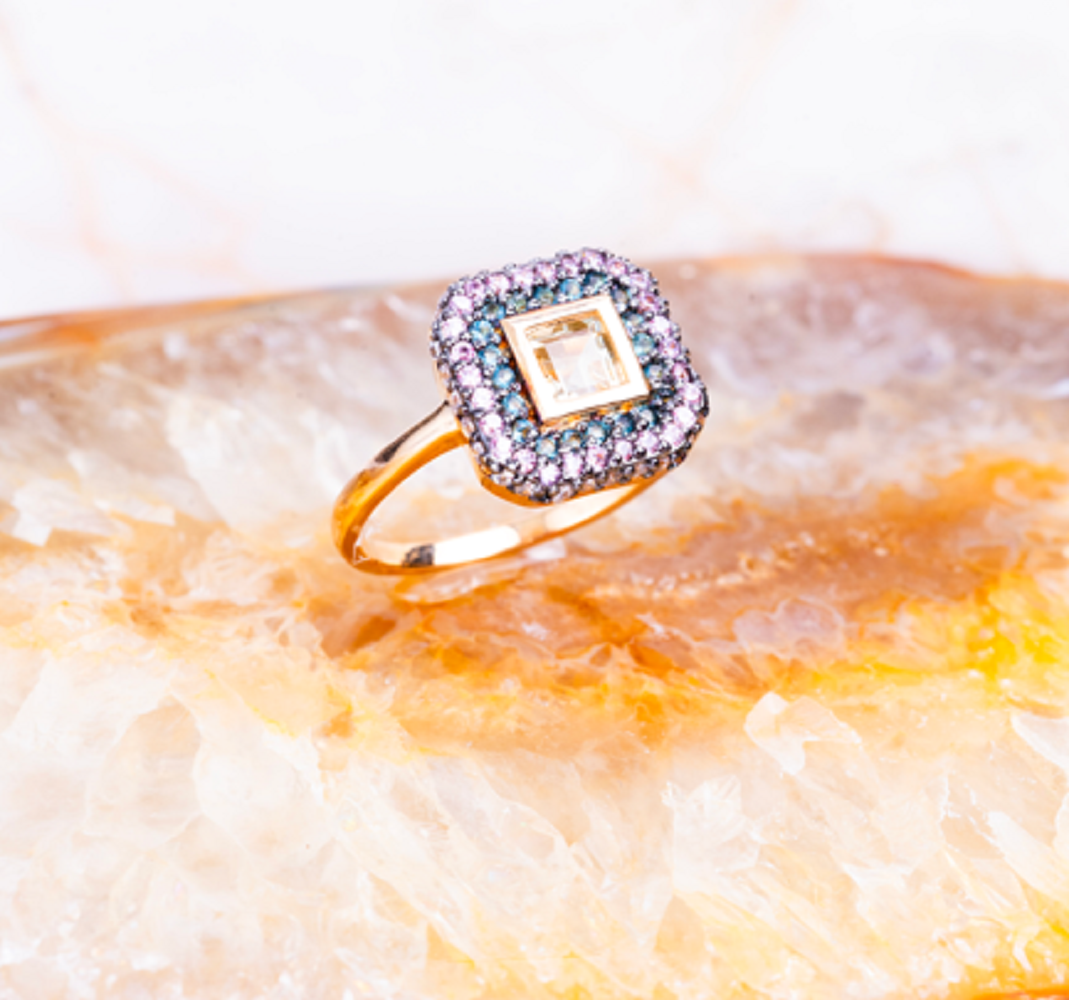Anel em formato quadrado, com cravação de cristal sintético quadrado central na cor verde clarinho, com detalhes cravados de zircônias rosê, azul turqueza e azul claras.
