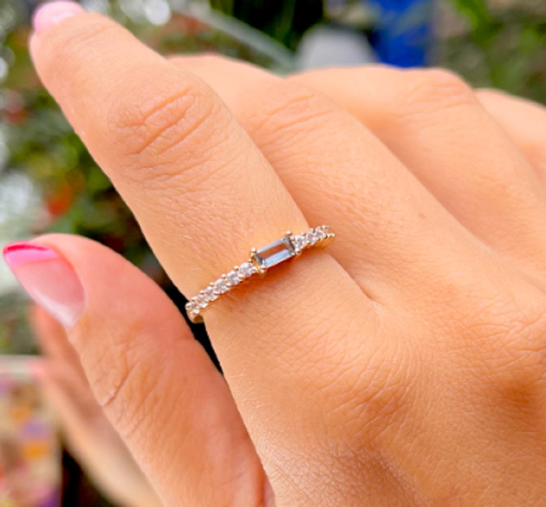 Anel banhado a ouro, com detalhes cravados em zircônias e uma pedra central do cristal blue london fusion, em formato retangular.