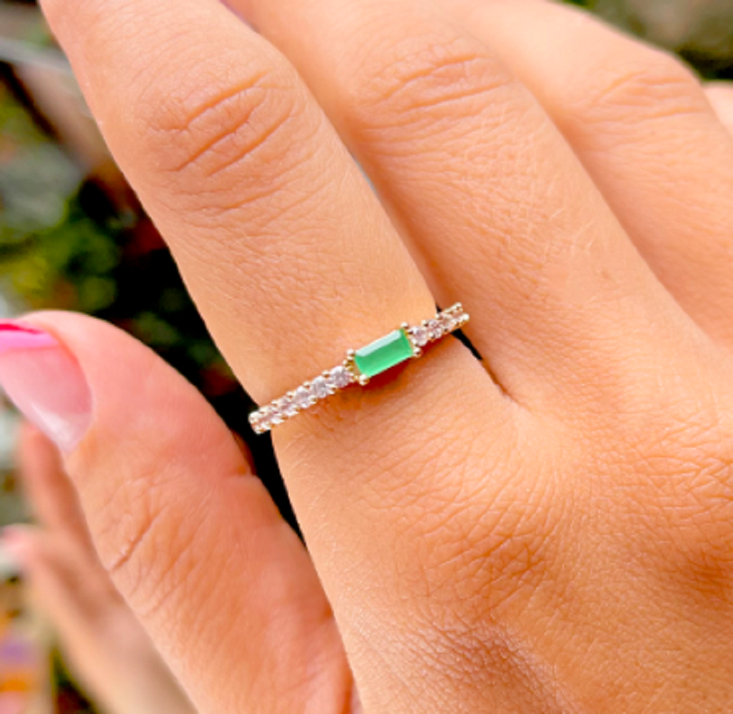 Anel estilo aliança com detalhes em zircônias e uma pedra central retangular, com cristal sintético de esmeralda.
