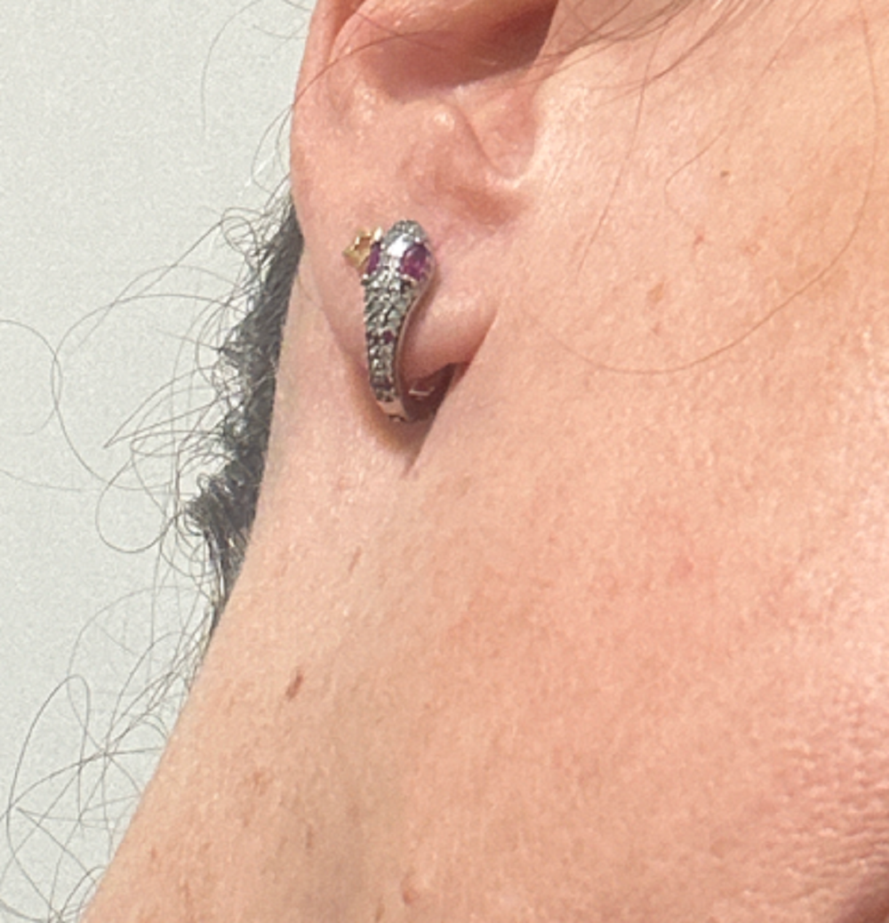 Brinco de argola, pequeno, com pedras de zircônias brancas e marsala cravadas.