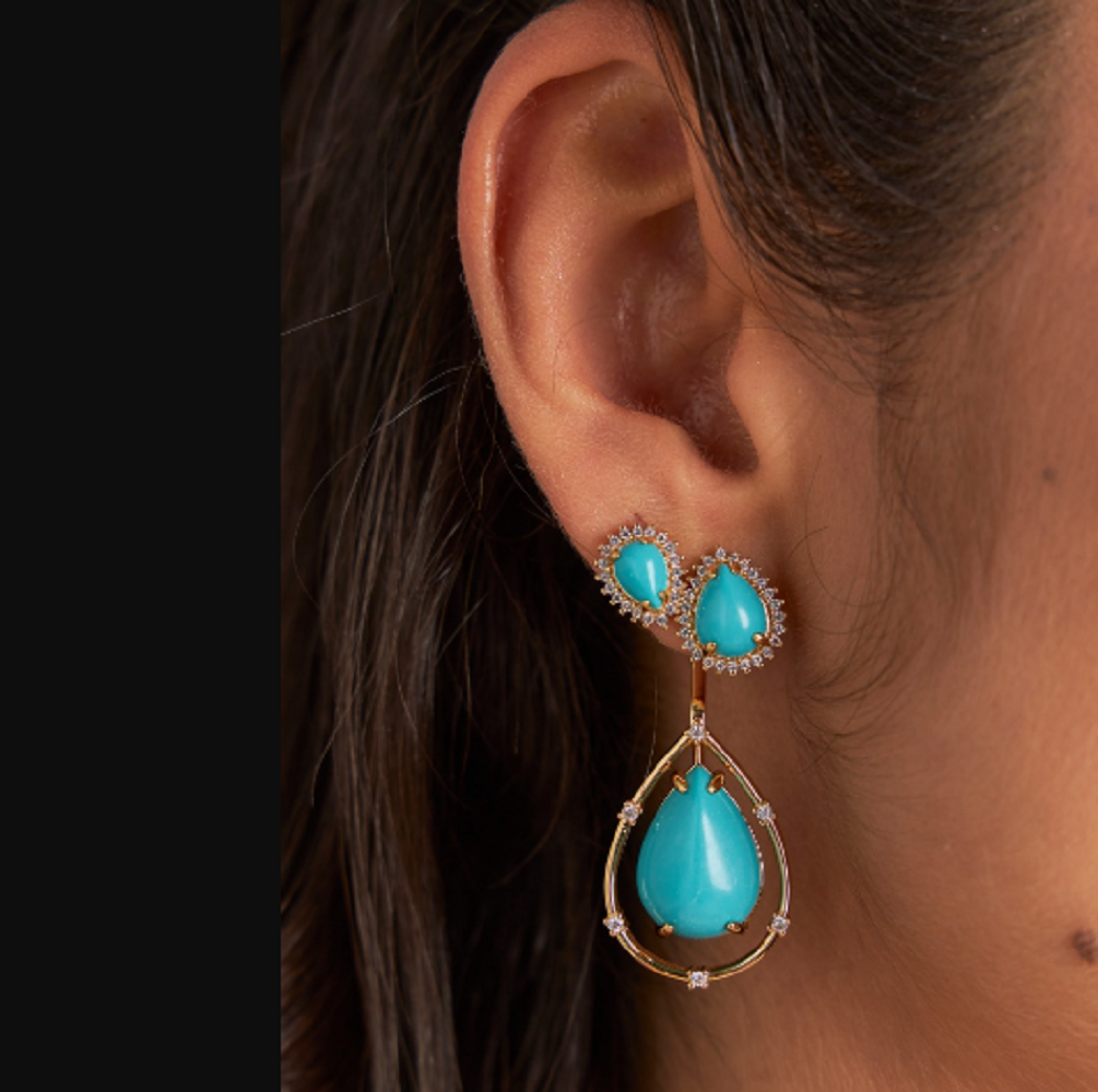 Brinco estilo vintage, com detalhes em pedra sintética cor turquesa e zircônias.