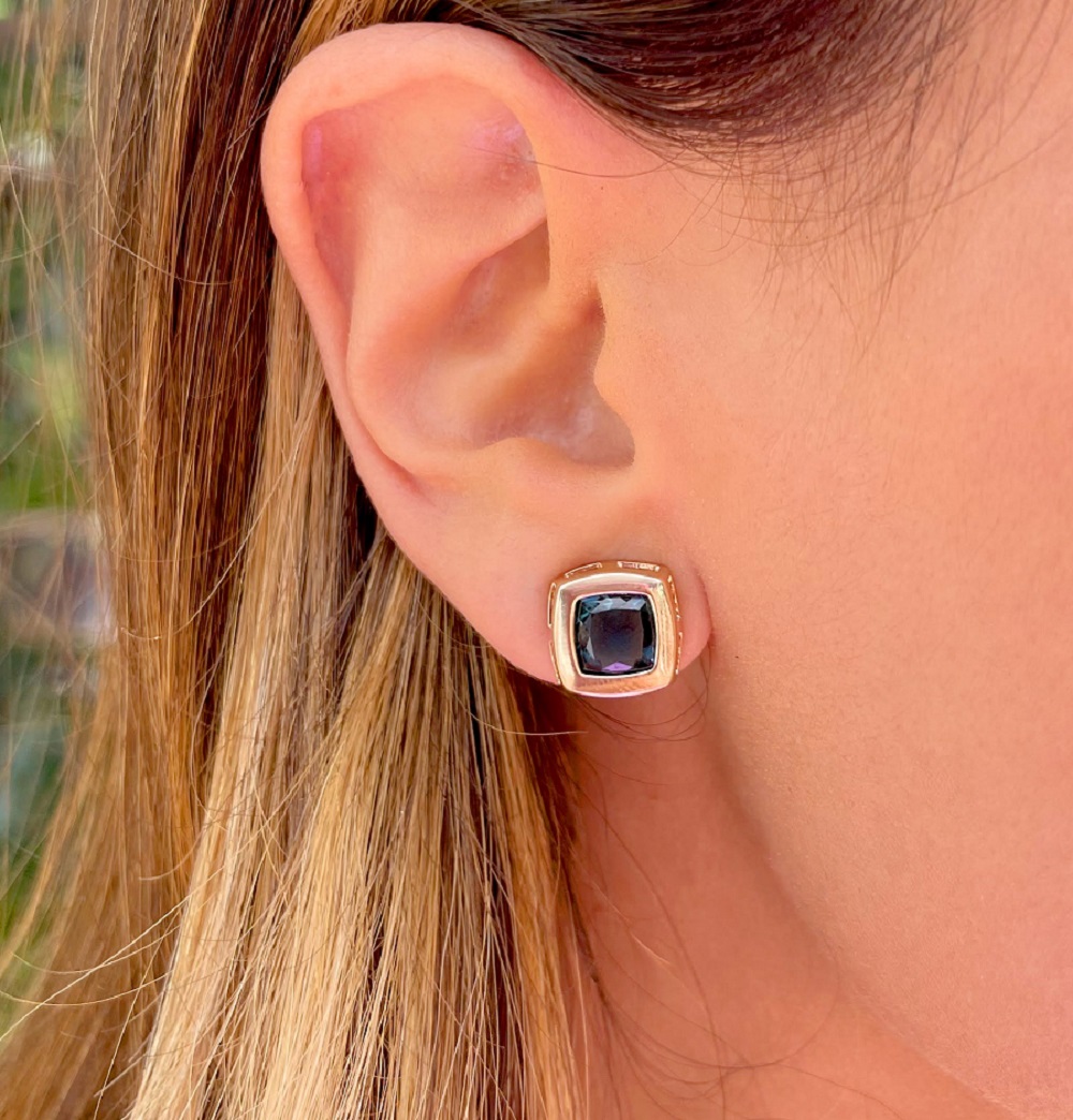 Brinco em metal, cravação inglesa, com cristal sintético no tom azul Topázio Azul.
