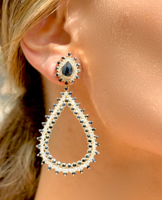 Detalhes com cristais sintéticos na cor Onix (preto), zircônias e uma gota central com pedra de Onix sintética.