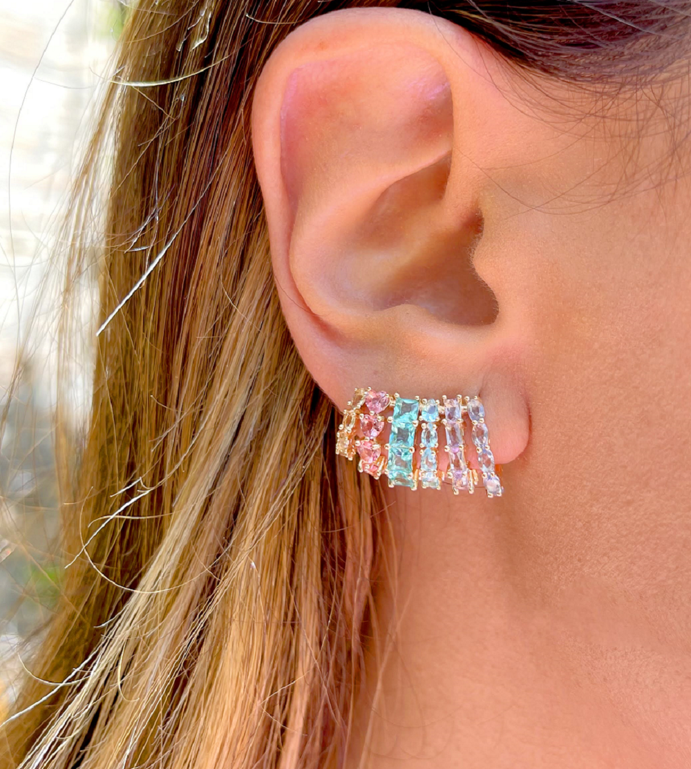 Brinco estilo Earcuff, com cravações de cristais sintéticos formando um degradê colorido.
