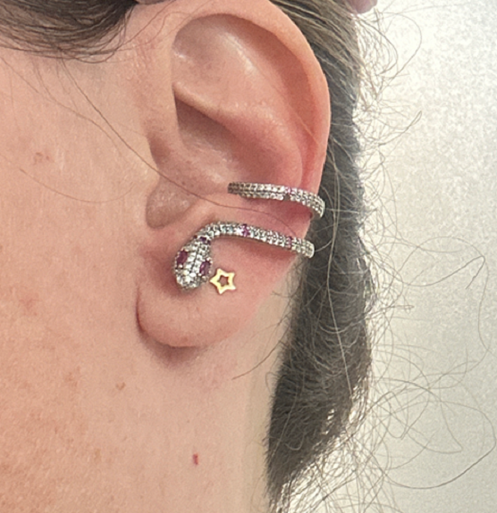 Brinco tipo earcuff em forma de serpente, com cravações de zircônias brancas e marsala.