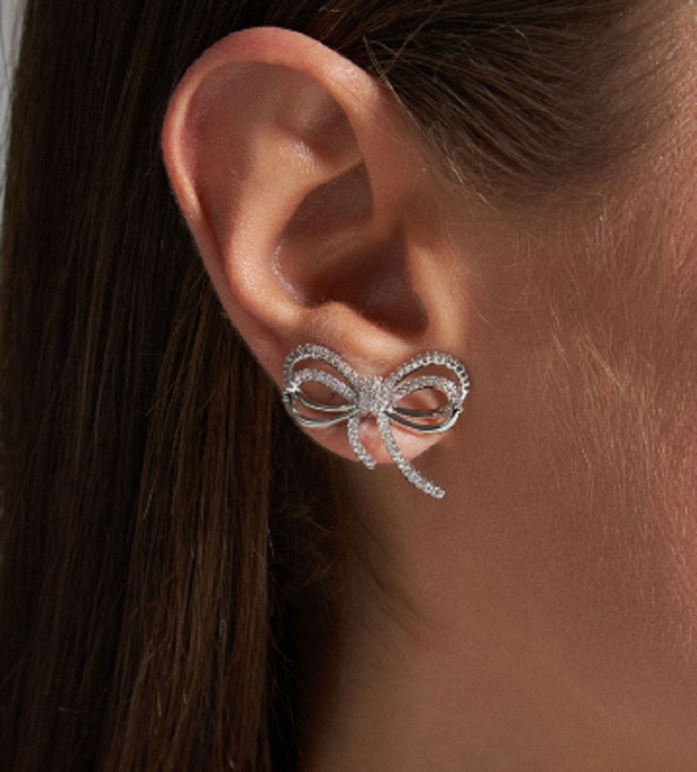 Par de brincos em formato de laço, com detalhes em zircônias