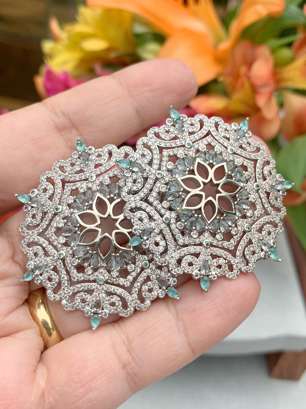 Peça totalmente cravejada em zircônias e navetes de cristais sintéticos topázio azul.