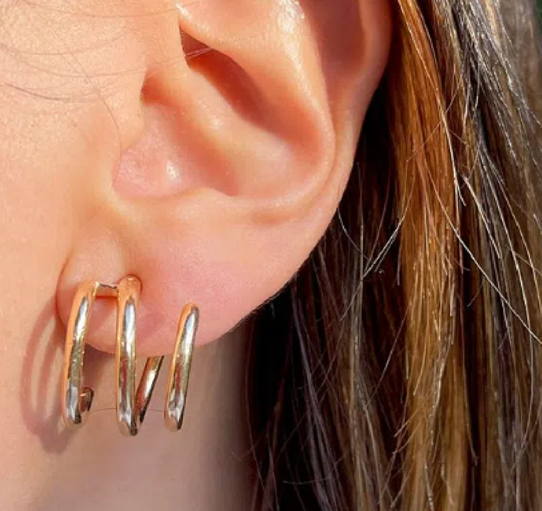 Brinco estilo earcuff, em formato de várias argolas que dão a impressão de uma mola.