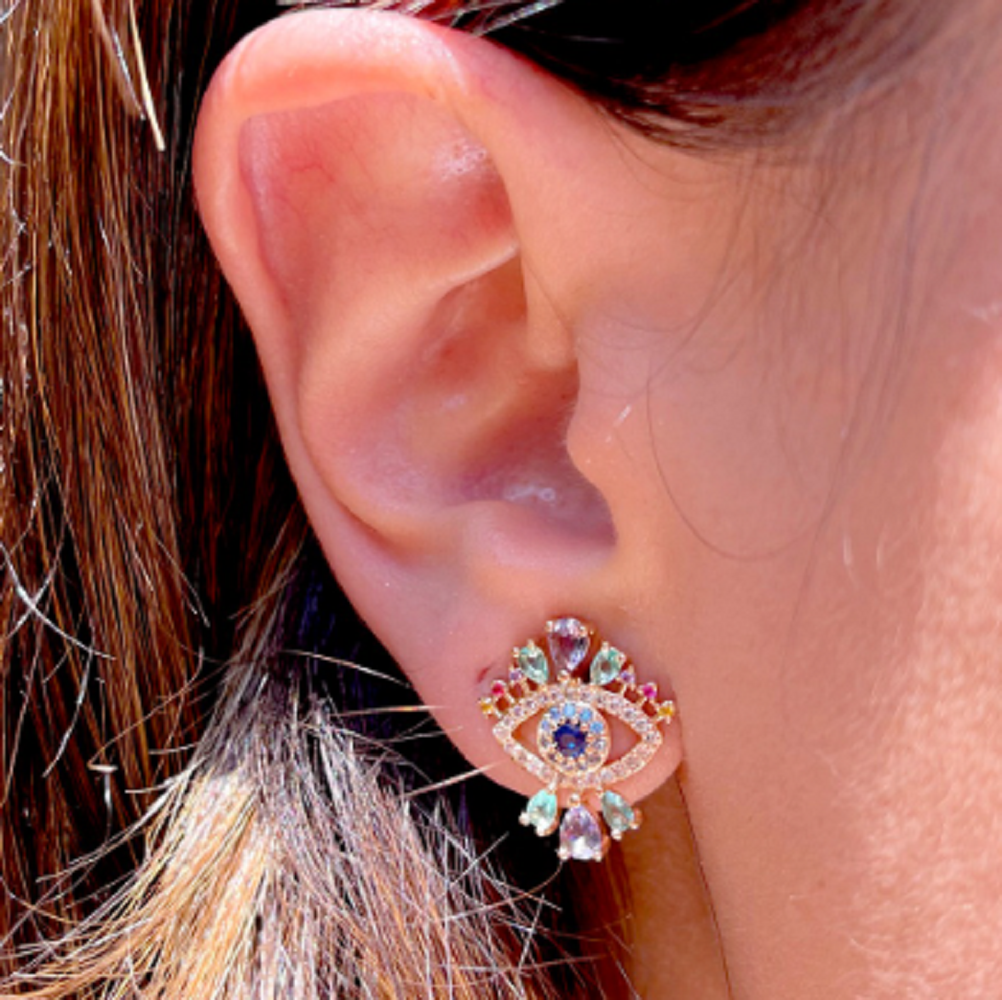 Brincos em formato de olho grego, com cristais sintéticos de várias cores e detalhes em zircônias.
