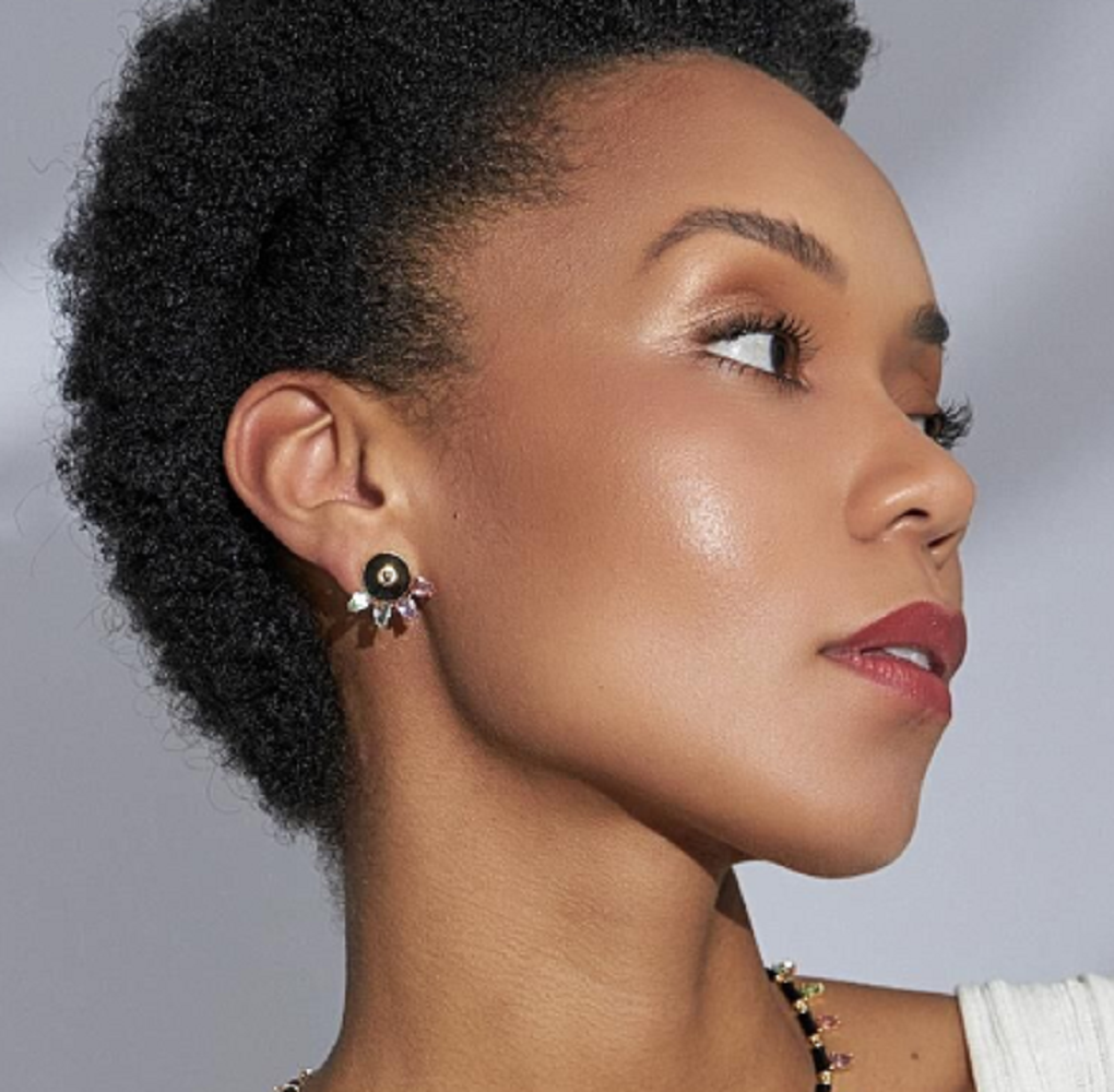 Brinco redondo, com detalhes em cristais coloridos, esmalte preto
