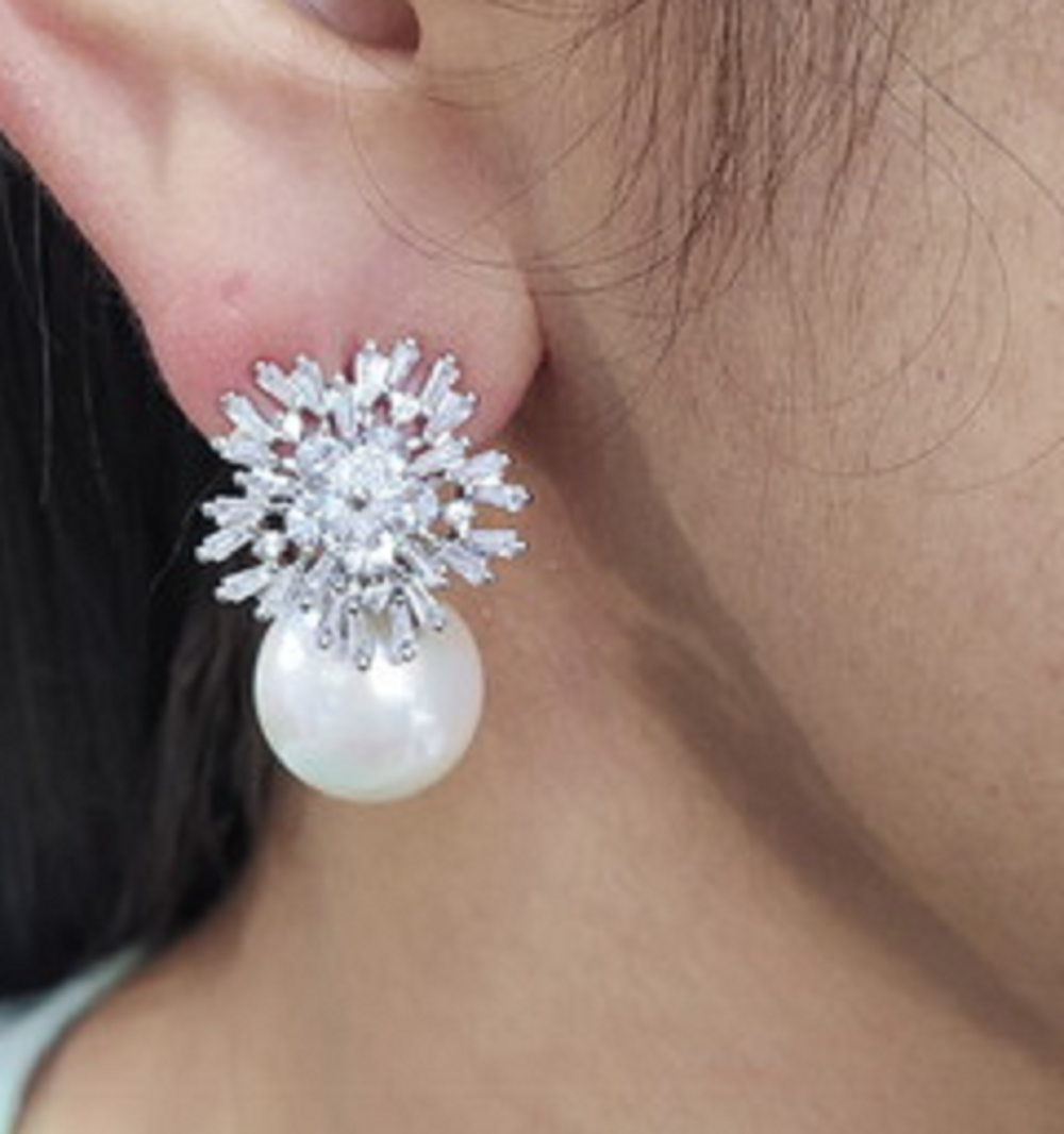 Brinco com pérola shell redonda, com detalhes cravejados em zircônias formando um formato de estrela.