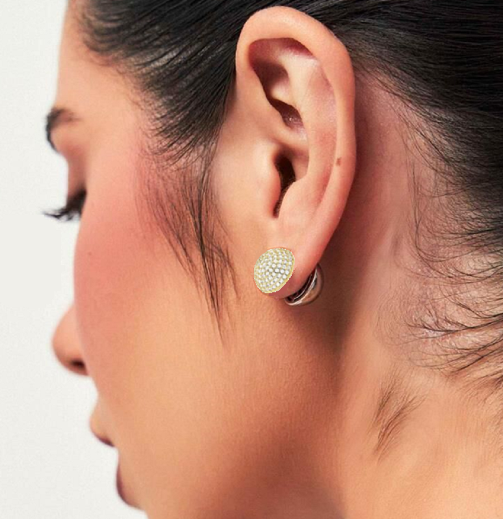 Brinco 2 em 1, sendo um lado banhado a ouro, cravejado com zircônias e outro lado banhado a rodium branco.