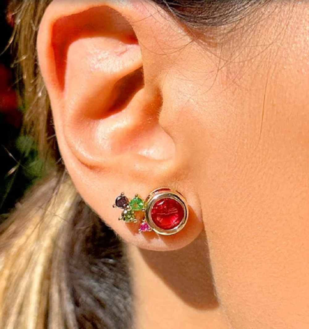 Par de brincos banhado a ouro amarelo, com detalhe de pedra redonda de turmalina rosa fusion, zircônias coloridas e cristais.