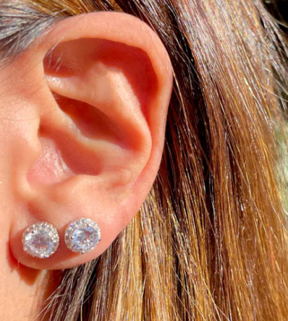 Par de brincos com uma zircônia redonda central, e moldura de zircônias.