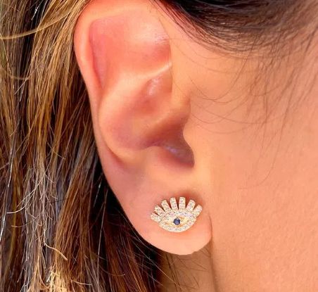 Par de brincos em banho de ouro, com zircônias brancas e azuis.