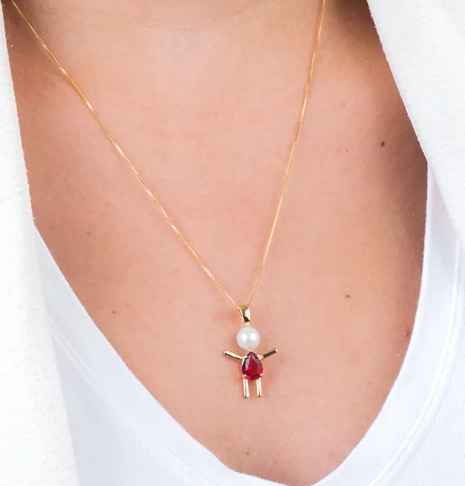 Colar com pingente menina, modelo tipo palito. Pingente possui uma pérola sintetica e um cristal sintético no corpo, na cor rubilita.