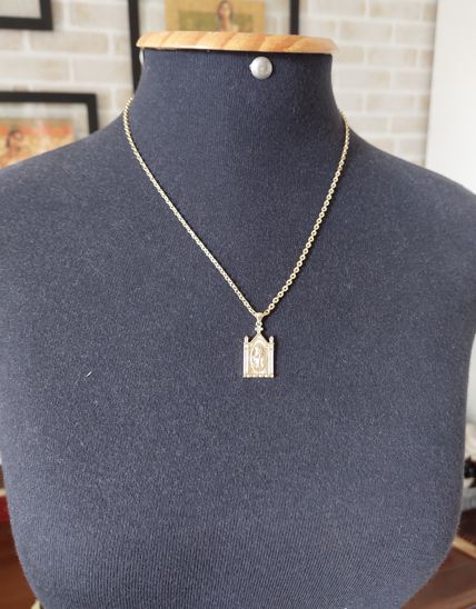 Colar com Pingente com imagem de Nossa Senhora das Graças e igreja, cravejada com zircônias brancas nas laterais e na cruz.