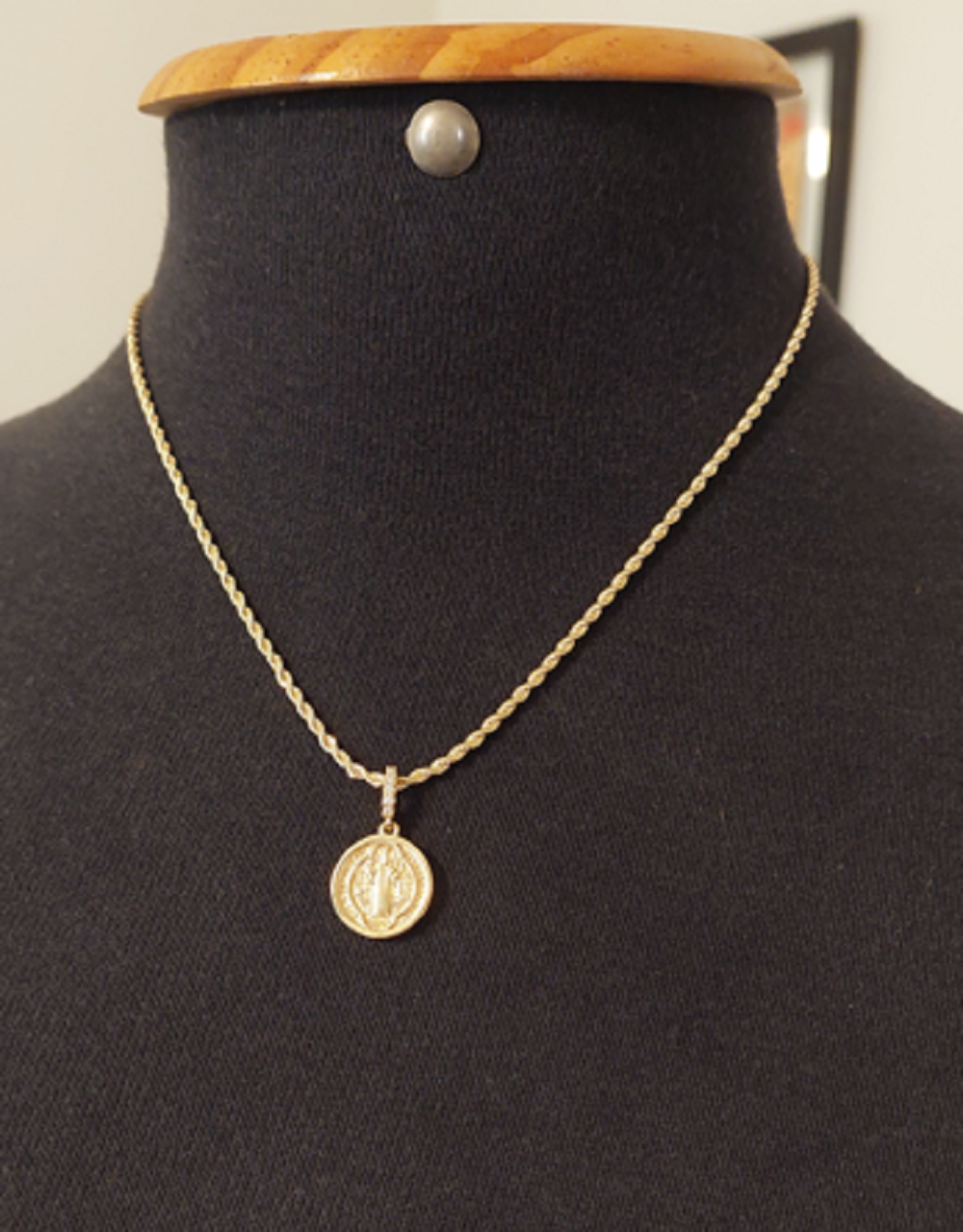 Colar com Pingente de S Bento, banhado a ouro, com corrente tipo cordão baiano e medalha com detalhes cravados em zircônias;