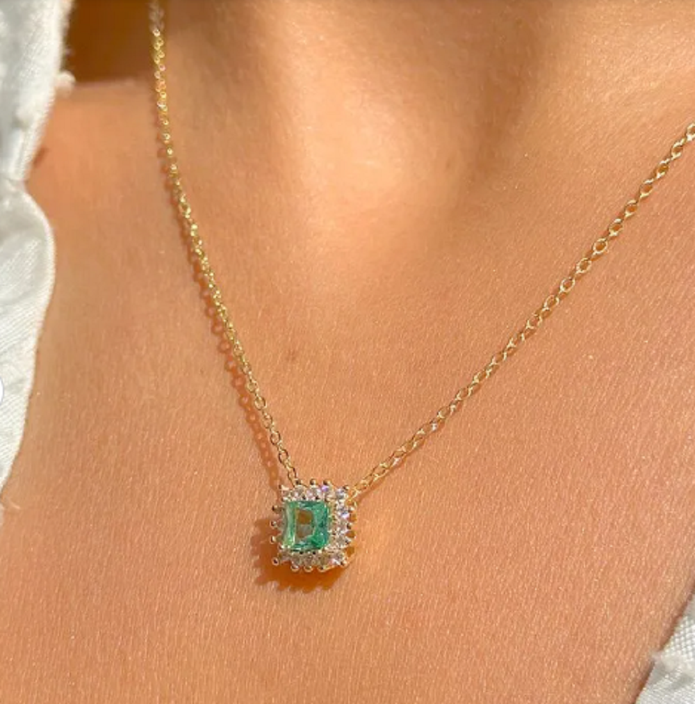 Colar em metal, com pingente delicado de cristal sintético Paraíba e moldura de zircônias brancas