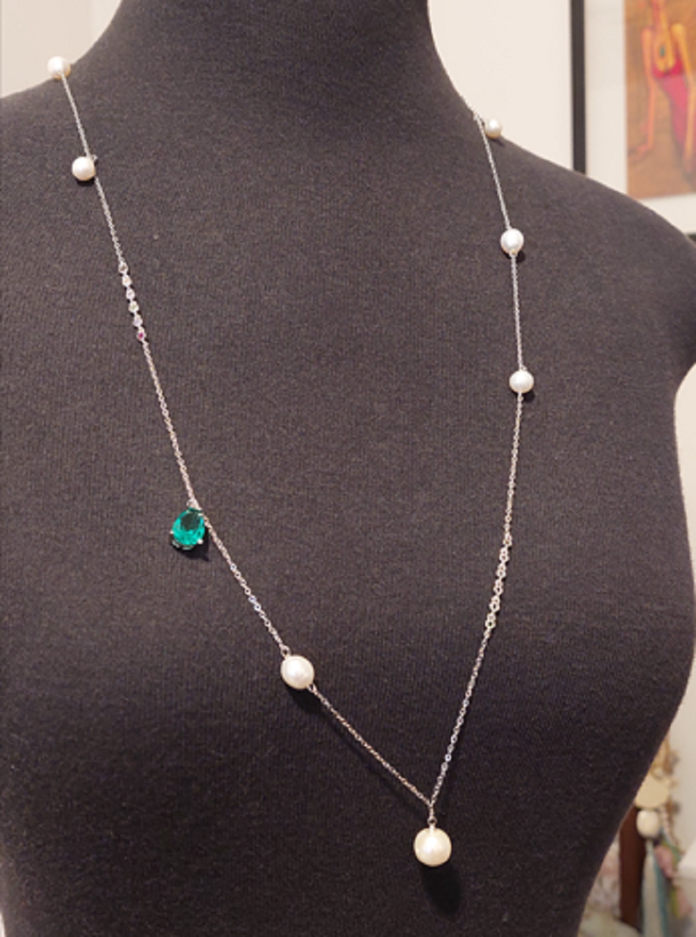 Colar longo de pérolas e cristais sintéticos de turmalina paraíba e rubi, pérolas de agua doce e Shell.