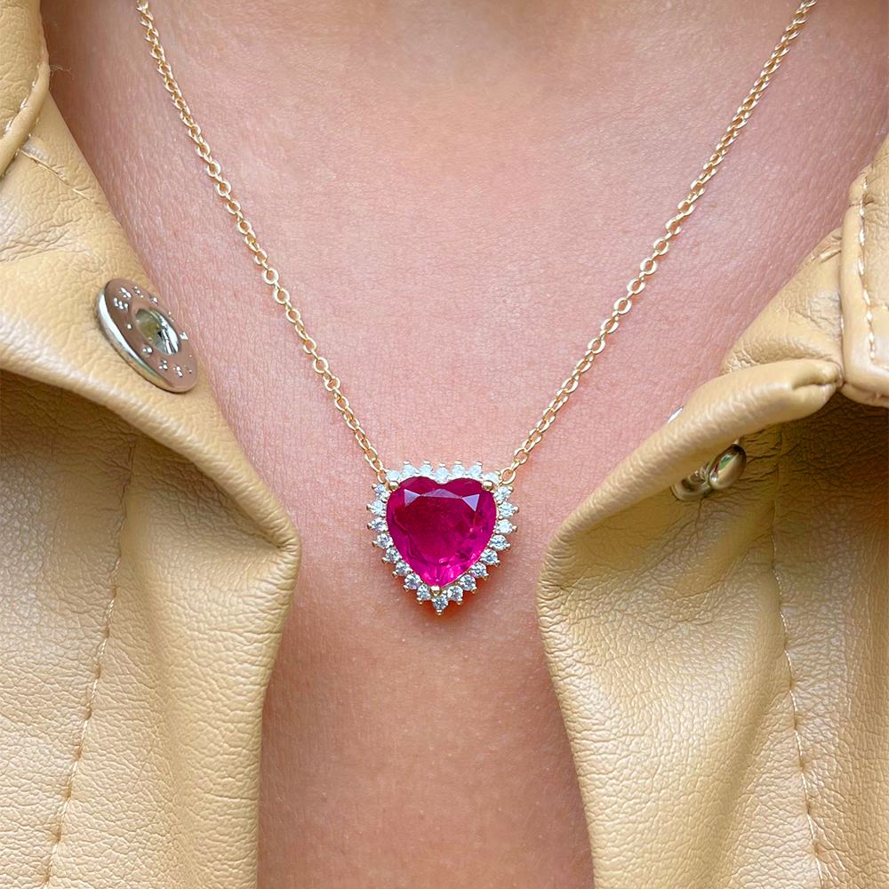 Colar banhado a ouro, com zircônias cravadas em torno de uma pedra fusion de turmalina rosa.