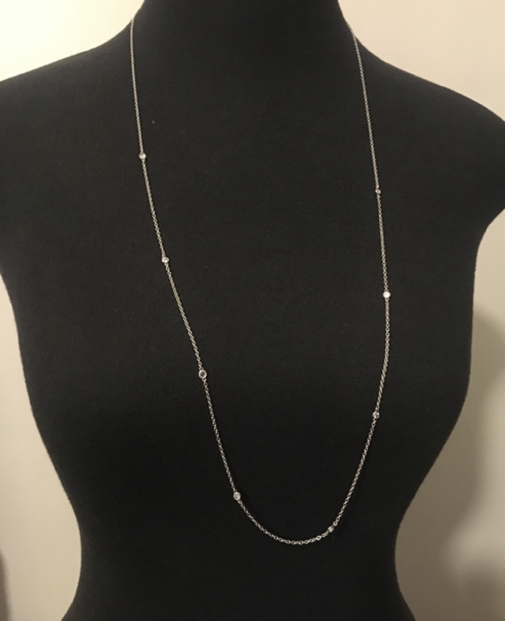 Colar longo em prata, com pontos de zircônias em sua extensão.