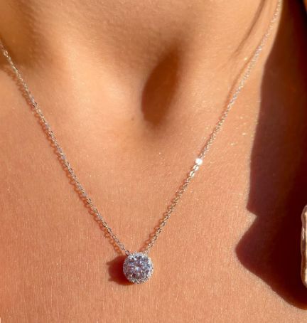 O colar em prata com pingente solitário ponto de luz de zircônia branca, banhada no ródio branco.