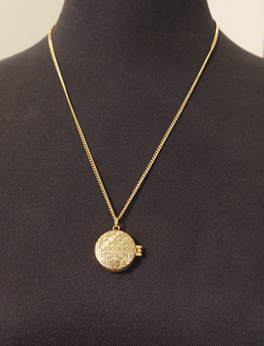 Corrente longa, med 60 cm aprox. Relicário com desenhos tipo mosaico e com fecho imantado.