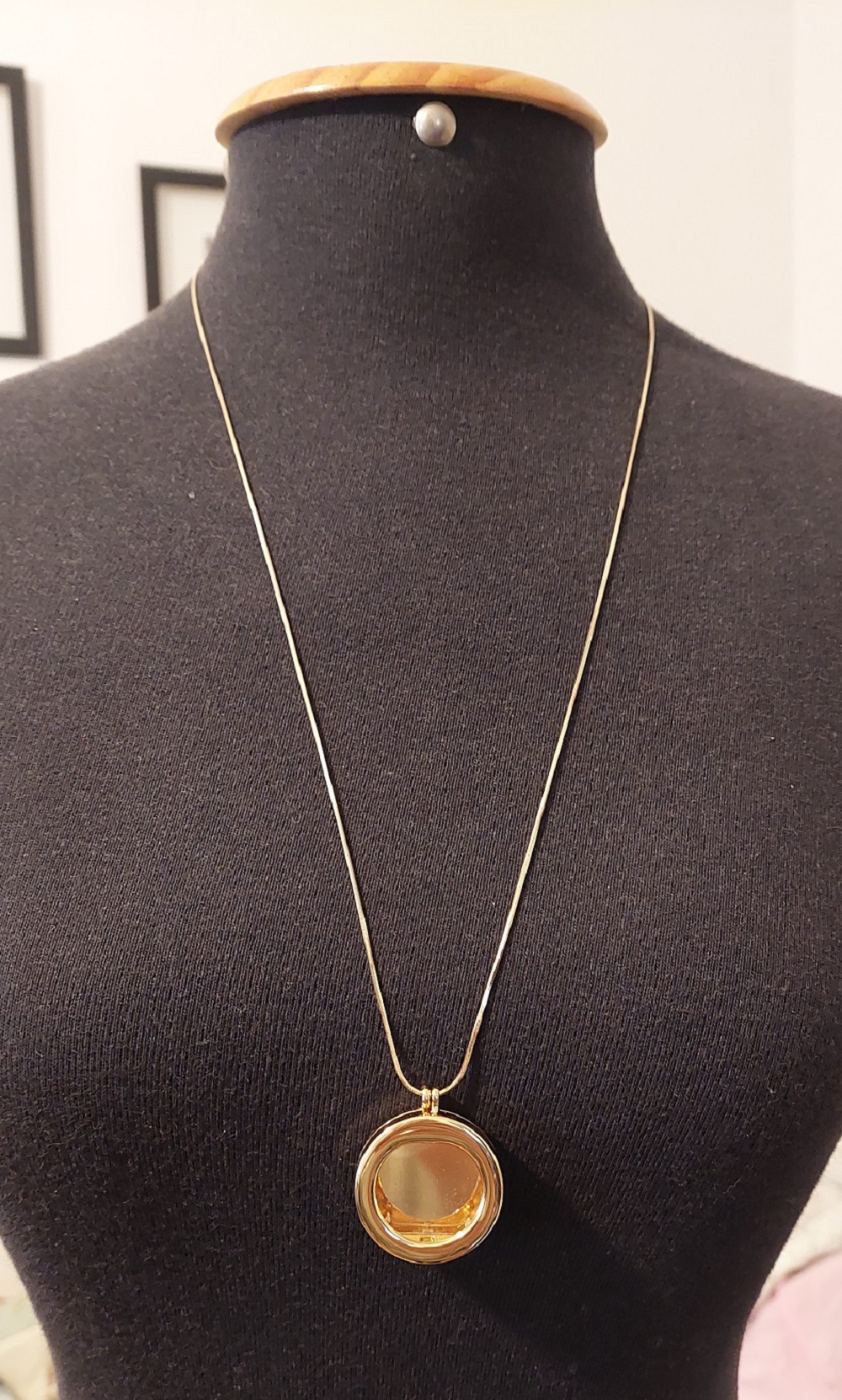 Acompanha a corrente, tipo laminada longa, 70 cm, banhada a ouro.