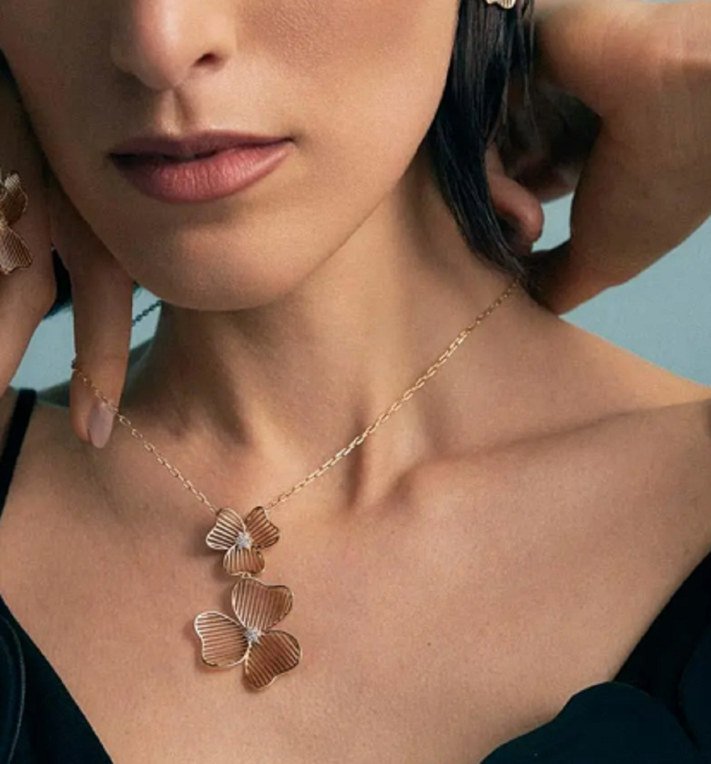 Colar estilo corrente, com pingente com detalhes florais cravejados de zircônias.
