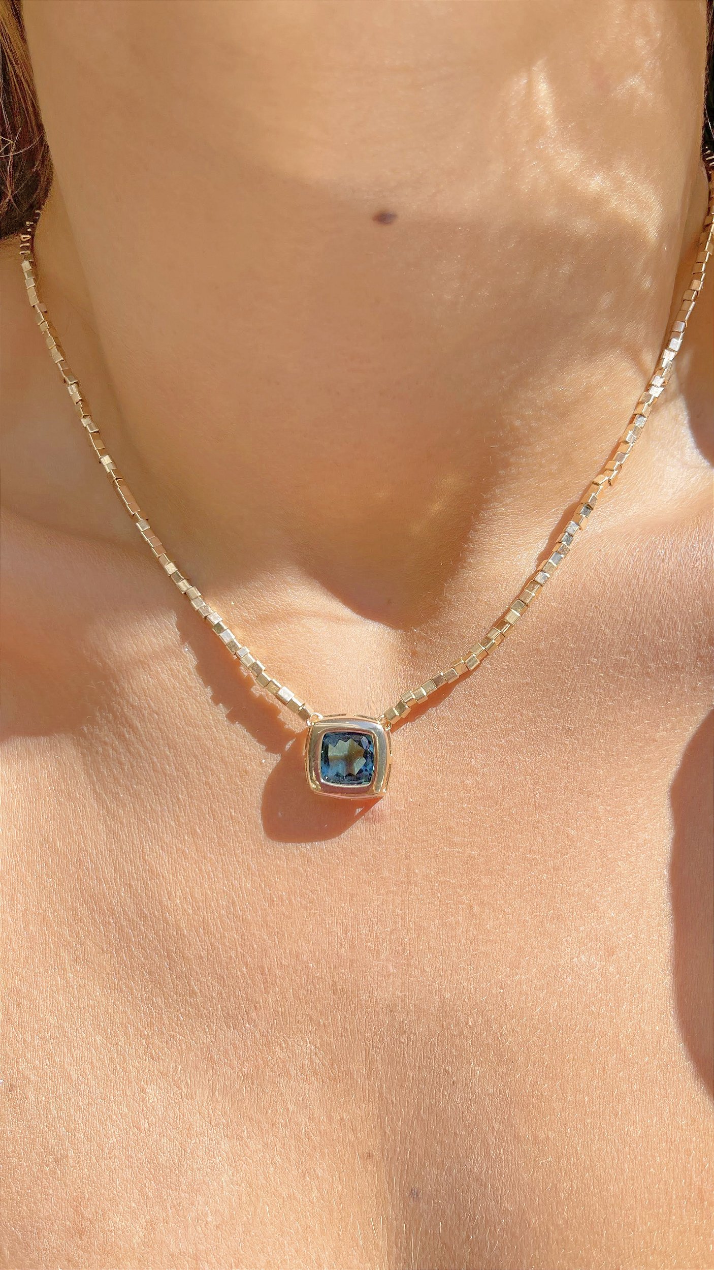 Conjunto de colar e brincos, banhados a ouro. Colar com detalhes em formas de cubos pela corrente e uma pedra central, quadrada, de cristal sintético London Blu, cravação inglesa.