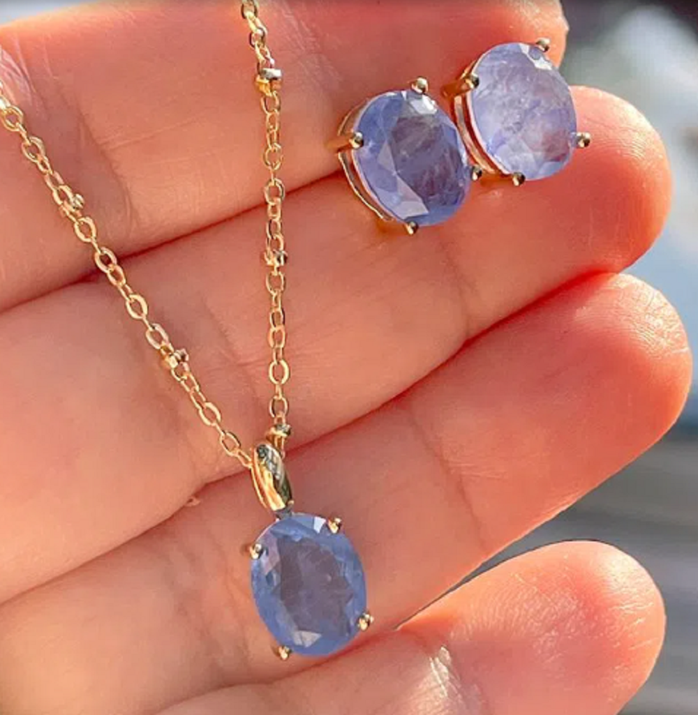 Conjunto de colar e brincos, em pedras cristal fusion de tanzanita, em formato oval.