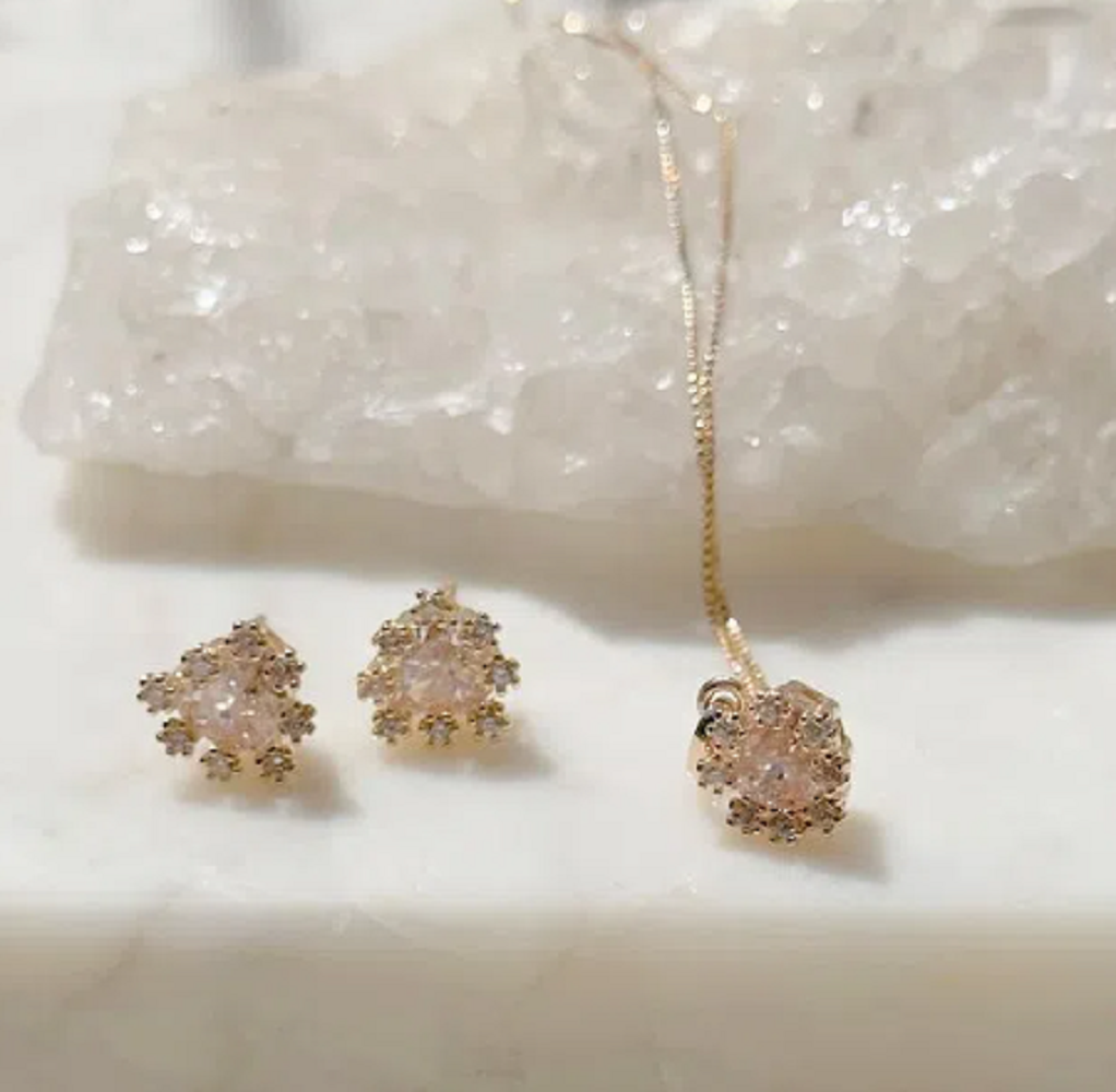 Conjunto de colar e brincos, estilo solitário em forma de coração, sendo uma pedra central de zircônia redonda e detalhes cravados, também em zircônias.