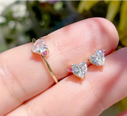 Conjunto de brinco e anel regulável com zircônia em formato de coração um ponto de zircônia vermelha.