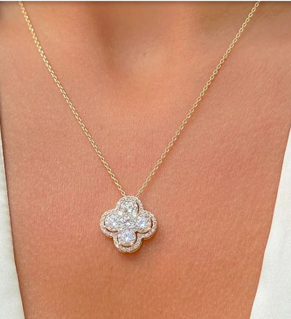 Colar com pingente em formato de trevo, totalmente cravado com zircônias. Peça banhada a ouro.