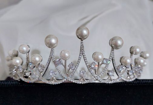 Coroa em metal com banho de ródium, pérolas shell e zircônia.