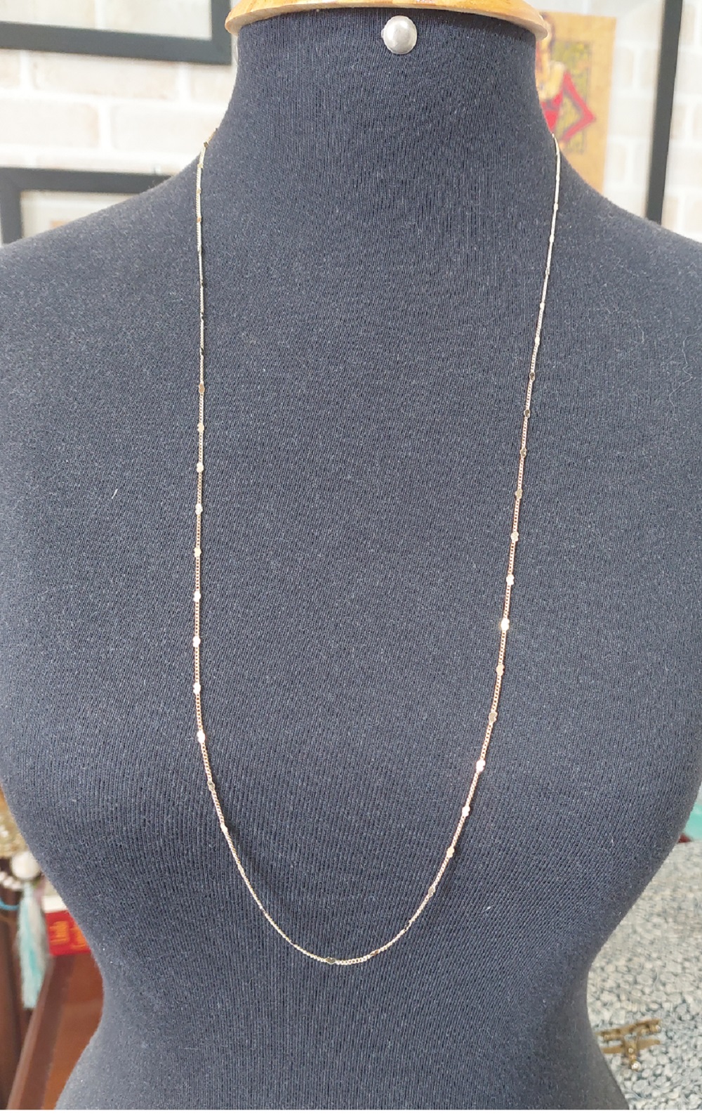 Corrente longa, maleável, com detalhes delicados chapeados em formato de coração.