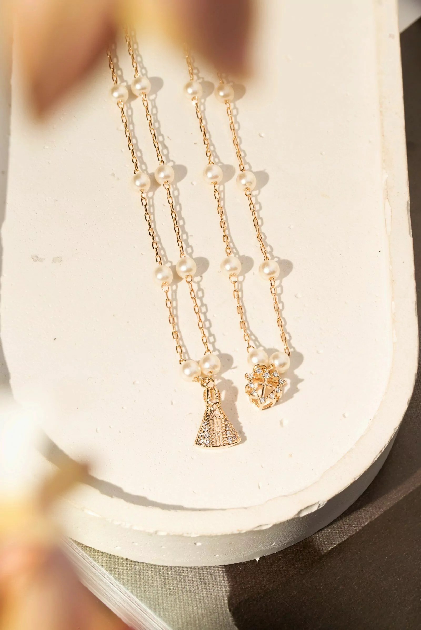 Colar estilo escapulário, com perólas e pingente: nossa senhora aparecida e sagrado coração.