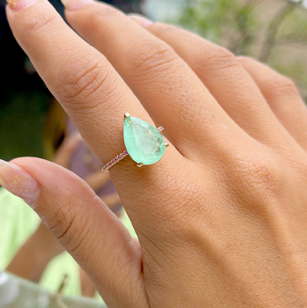 Anel com pedra fusion de esmeralda colombiana, com detalhes em zircônias rosas.