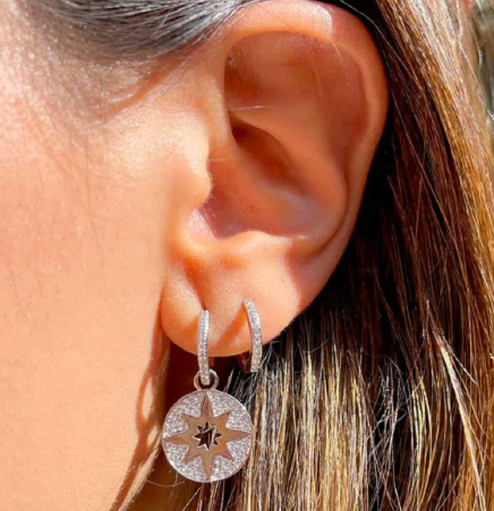 Brinco estilo argola cravejada em zircônias brancas, com pingente com design em forma de estrela, cravejado em zircônias brancas.