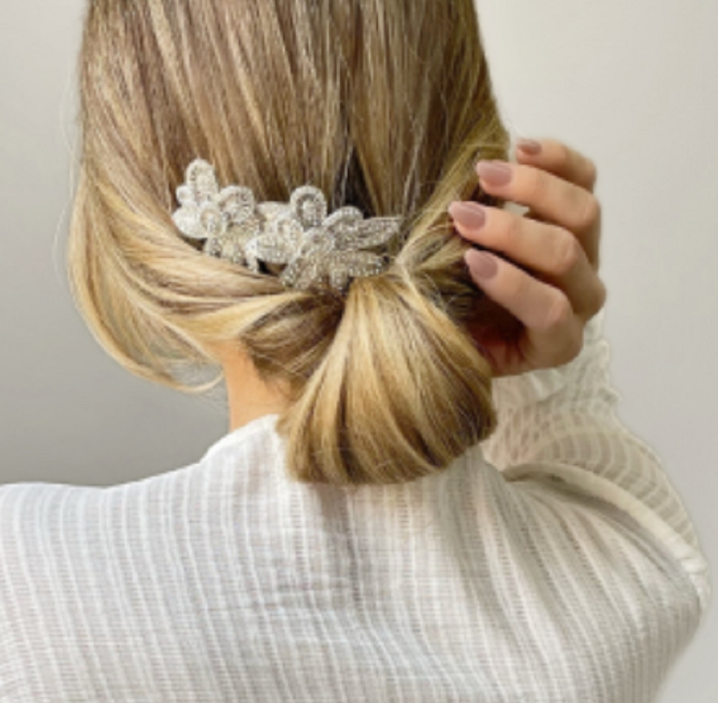 Conjunto com duas peças em metal, com banho de rodium cravações em cristais.
