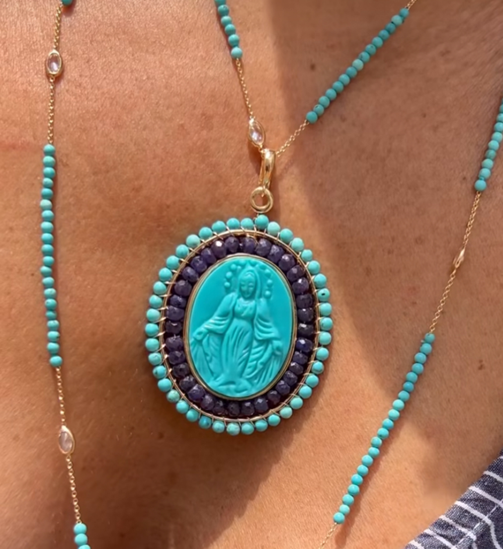 Pingente com a imagem de Nossa Senhora das Graças em resina azul, e com detalhes em pedras de turquesas e safiras naturais.