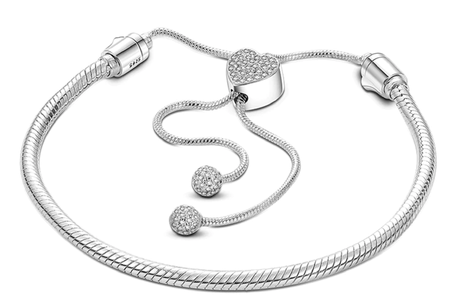 Pulseira maleável e regulável, INSPIRADA na marca Pandora, em prata 925, com fecho coração com cravações de pedrinhas brancas e detalhes nos penduricalhos.