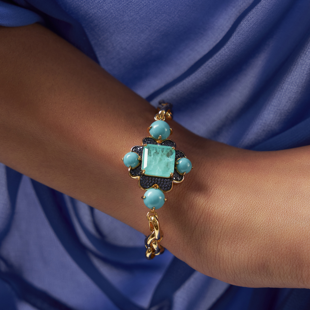 Pulseira estilo oriental, com detalhes cravejados em zircônias azuis, pedra central de turmalina paraíba fusion e detalhes em esmalte na cor turqueza.